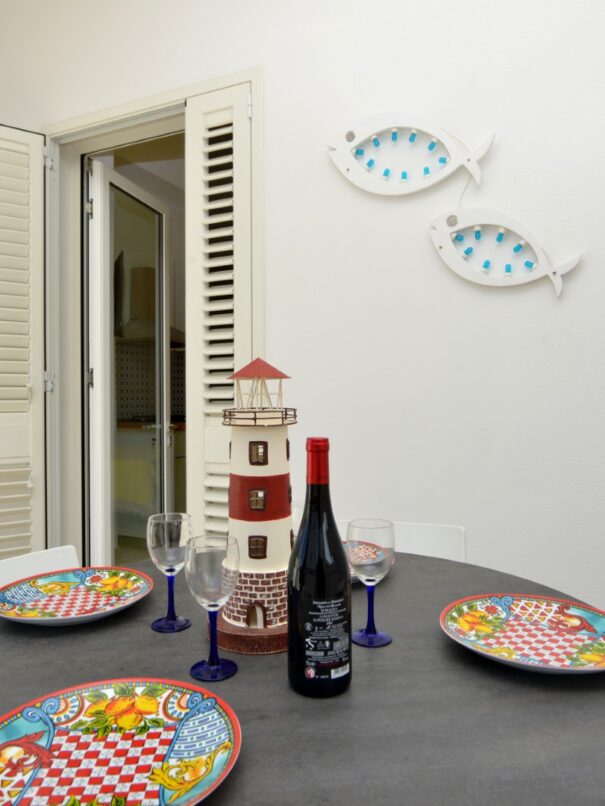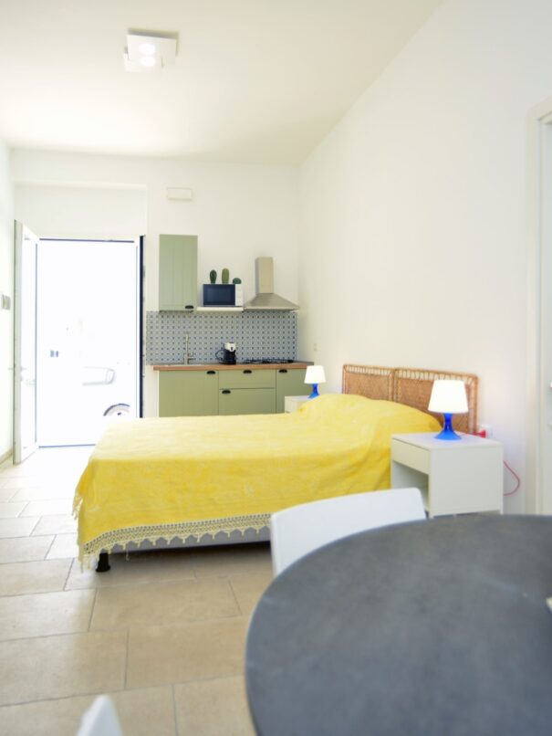 Monolocale al piano terra con letto matrimoniale, angolo cottura e bagno privato. Dispone di spazio esterno arredato, ideale per mangiare all’aperto.